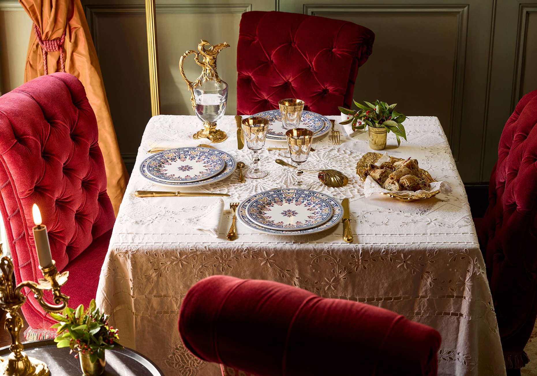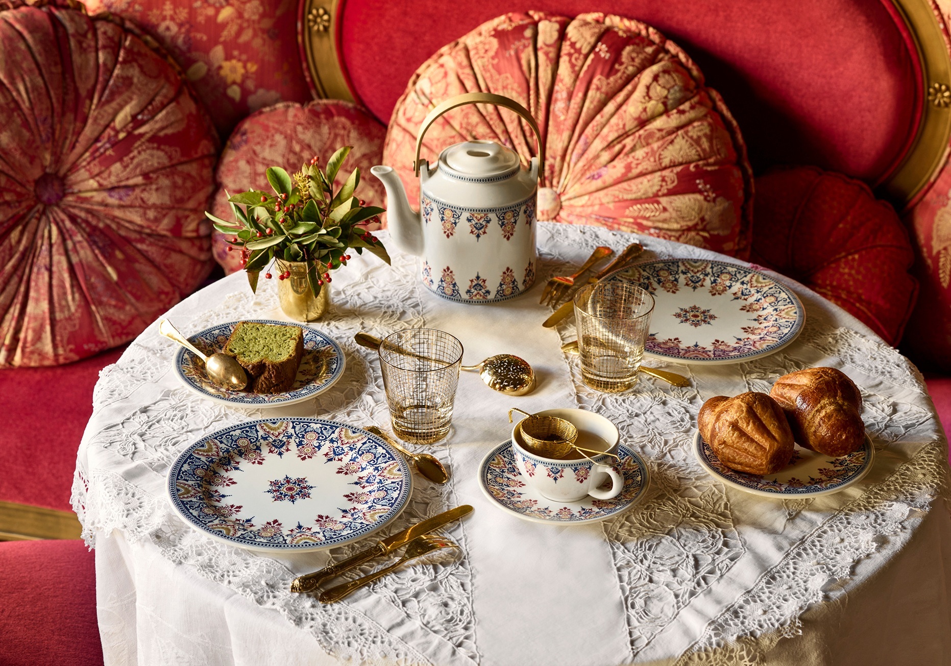 Коллекция Rouen Or вдохновлена архивами Жьена и сочетает в себе глубокий синий, бордовый и золотые оттенки.